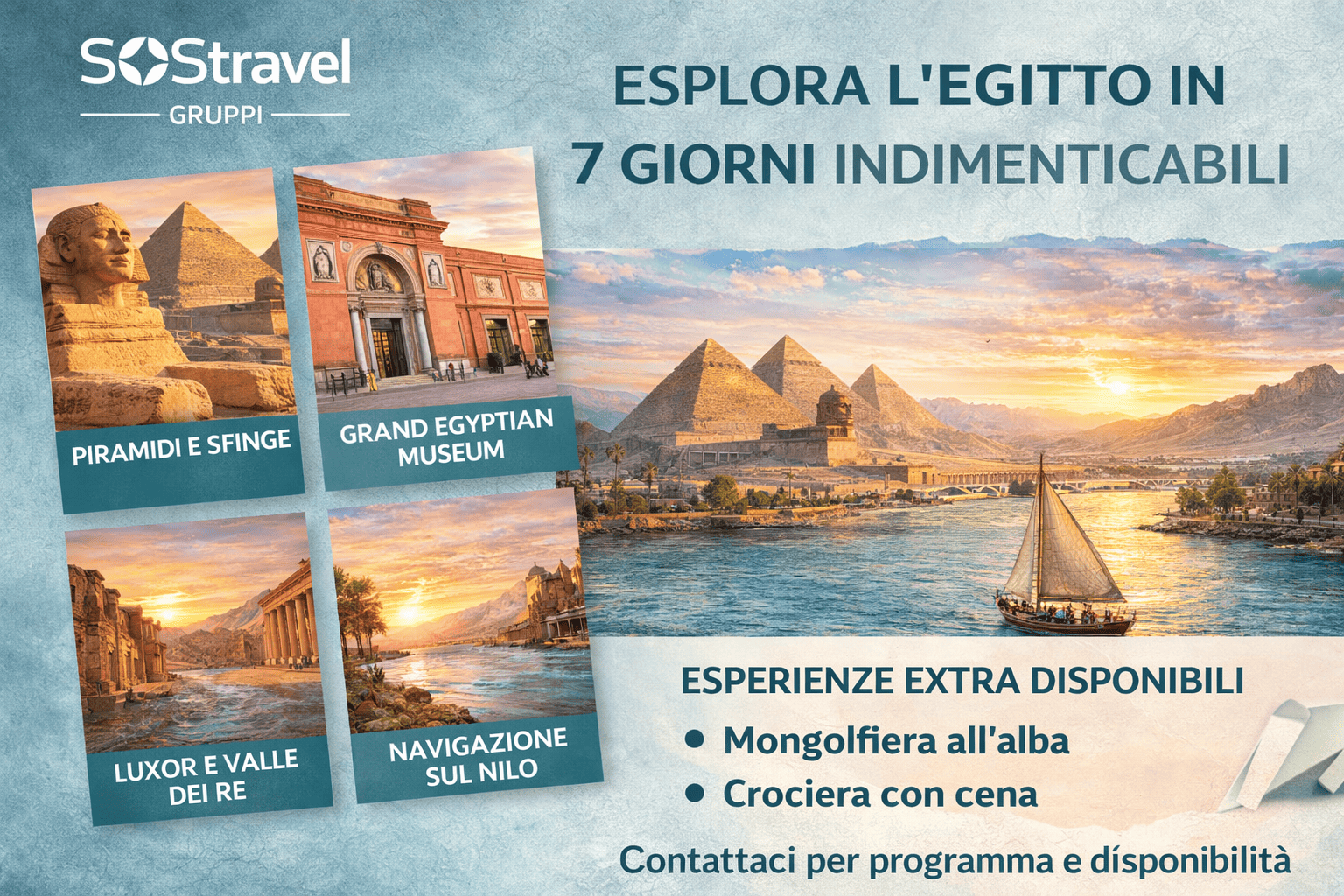 Dalle maestose Piramidi di Giza ai templi di Luxor, passando per il fascino intramontabile del Nilo, questo itinerario è pensato per offrire un’esperienza completa, coinvolgente e perfettamente bilanciata.  Un tour ideale per gruppi, completamente personalizzabile, con servizi selezionati e guide esperte per vivere al meglio ogni tappa.